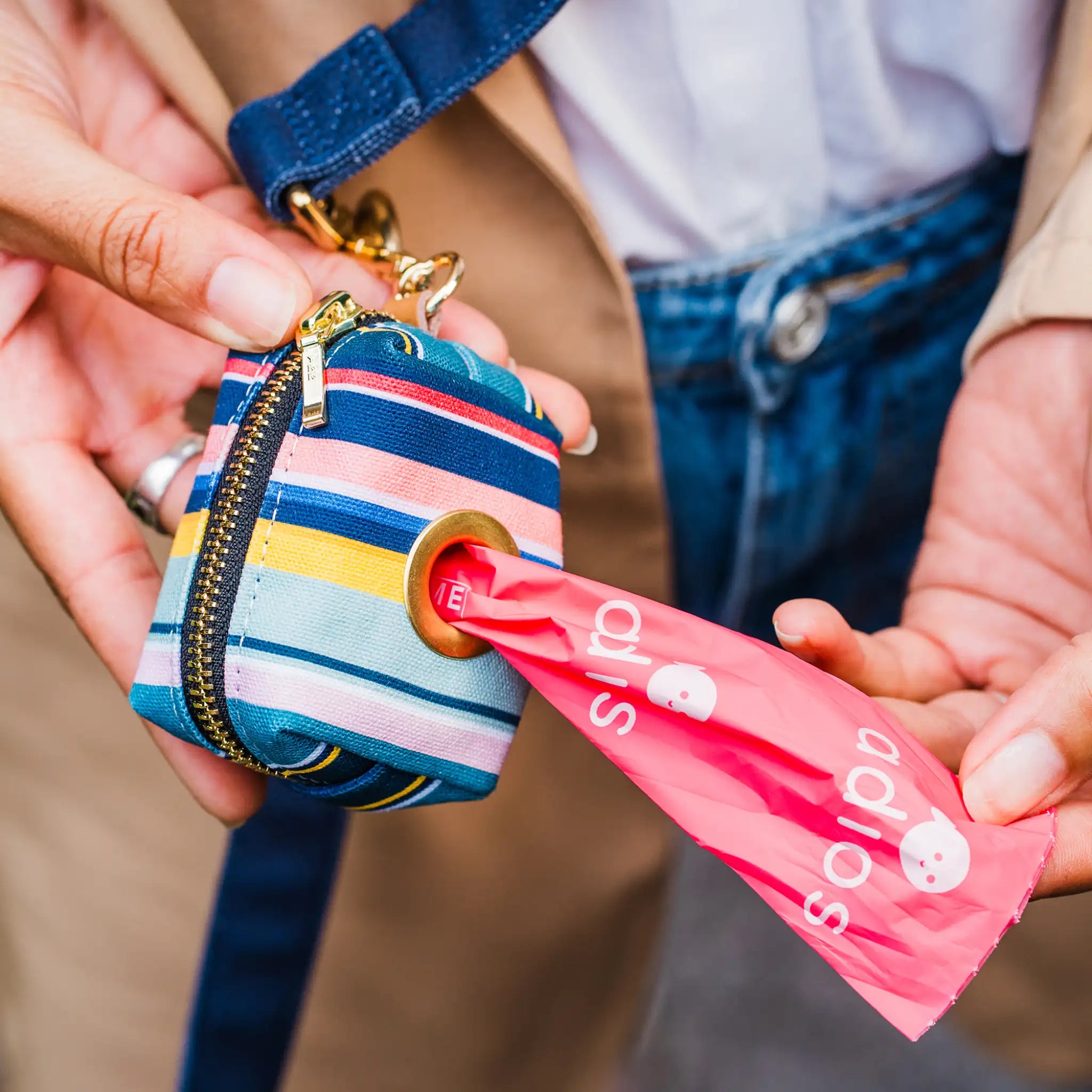 A refined organic cotton waste bag holder designed for everyday walks.